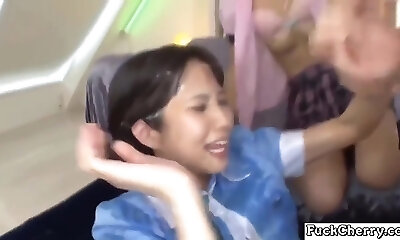 Skinny Asian girl Yuu Asakura enjoys having her first gangbang