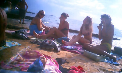 Upshorts dick show for group of girls on beach