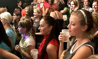 Stunning guy is dancing for a bunch of aroused babes and getting prepared for multiple blowjobs
