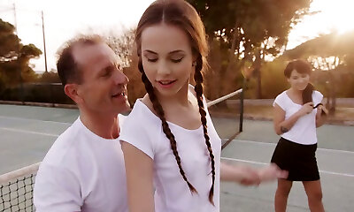 Horny trainer fucks couple of glorious slim girlies after nice tennis game