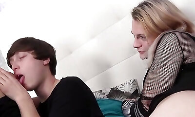 Slender brunette caught a young man sucking his stepdad's cock and then she joined them for a great bisexual threesome