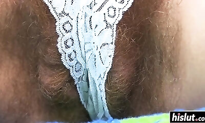 Curvy hairy brunette Samantha Jane plays with her bush through her semi-transparent panties