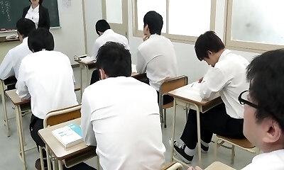 Tutor Yuuno Hoshi gets mad at her class then sucks multiple cocks