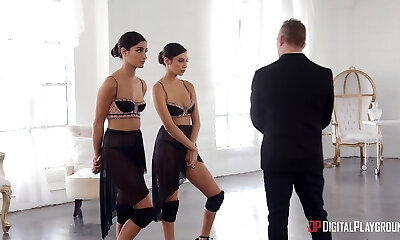 Flexible dancers Gianna Dior and Emily Willis poked by one guy